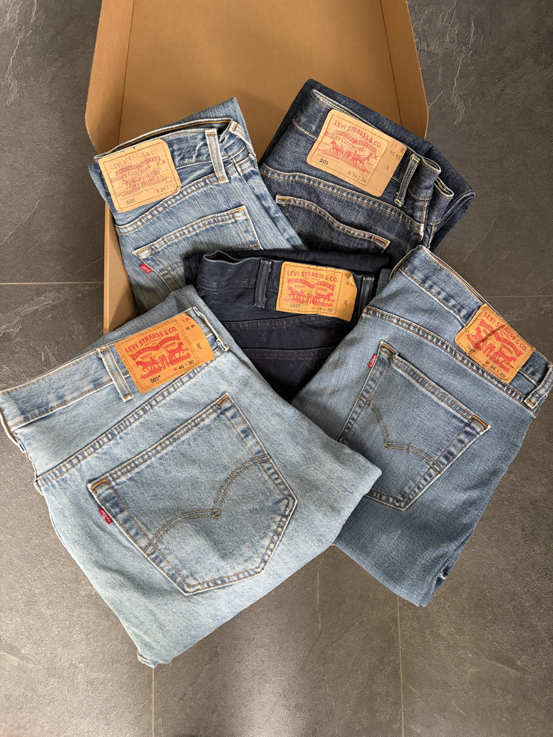 Deze box bevat 5 broeken van Levi’s in het 501-model. De box bevat allemaal grade A items. Dit houdt in dat de items nog in goede staat zijn zonder gaten en vlekken. Er is een human-error marge van 10% van je pakket. Deze bestaat omdat onze medewerkers soms wat kunnen missen tijdens het uitzoeken en checken van grote hoeveelheden kleding.